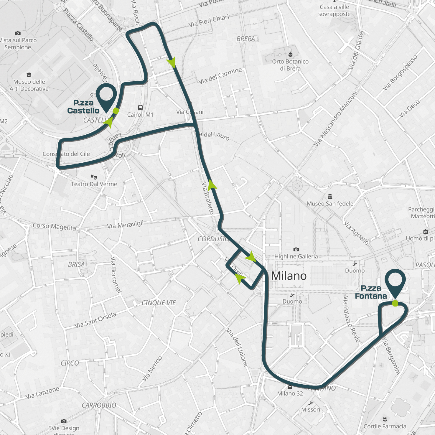 Attenzione: la fermata di partenza è diversa da quella di arrivo. Se sali a Piazza Castello, scenderai a Piazza Fontana dopo 30 minuti (e viceversa).